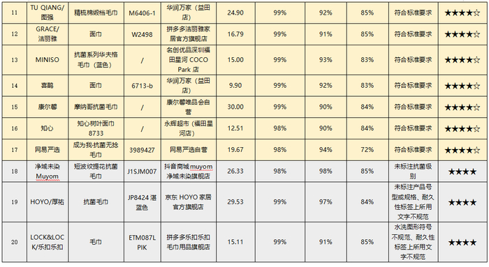 抗菌毛巾抗菌效果比较试验报告出炉 净域未染、HOYO、乐扣乐扣品牌标签标识信息异常