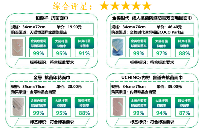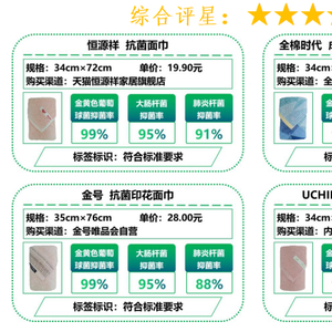 7月5日,市消委会正式发布《抗菌毛巾抗菌效果比较试验报告》。报告显示,本次测试的20款抗菌毛巾样品中,恒源祥、全棉时代、金号、内野品牌样品获评五星;20款样品50次水洗后,金黄色葡萄球菌、大肠杆菌、肺炎杆菌三种菌的抑菌率检测结果均符合相关标准要求;净域未染、HOYO、乐扣乐扣品牌样品使用说明存在不同程度的信息缺失,如未标注产品抗菌级别、未标注产品号型或规格、所用文字不是国家规定的规范汉字等。