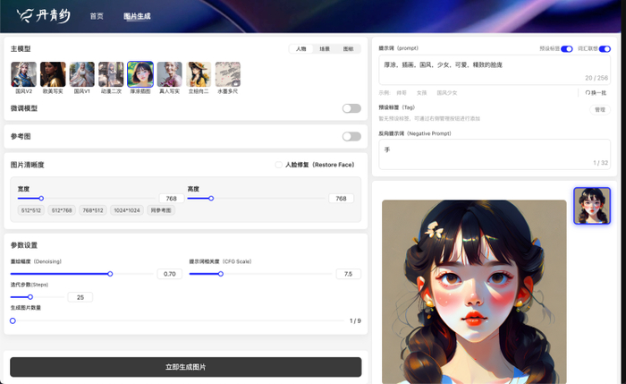 丹青是网易伏羲自研的中文模型,它基于原生中文语料数据及网易自有高质量图片数据训练,为100%的国产大模型。该模型训练数据经过严格的文本及图片审核,在确保数据来源合规、生成内容合规的同时,使得模型拥有较好的中文理解能力,创作出的作品能更好满足中式审美。