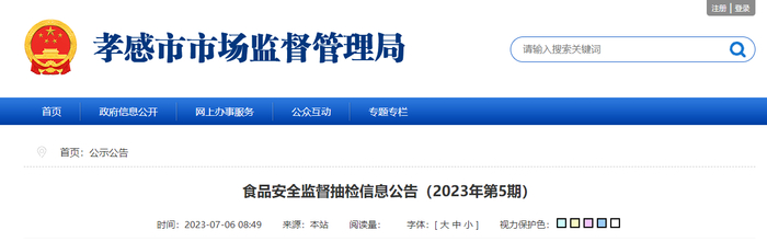 中国质量新闻网讯 2023年7月6日,湖北省孝感市市场监督管理局网站发布食品安全监督抽检信息公告(2023年第5期)。