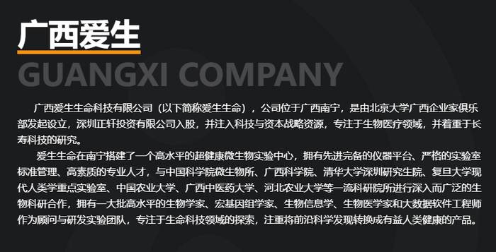 官网资料显示,爱生生命2017年成立,由北京大学广西企业家俱乐部发起设立,公司注册地为广西南宁市,提供的技术产品服务涉及益生菌、肠道菌群检测服务、微生物组学科研服务,专注于生物医疗领域,并着重于长寿科技的研究。值得一提的是,从官方微信公众号发布的信息可以看到,这家公司在其商城还推荐和销售美国原装进口的NMN相关产品。