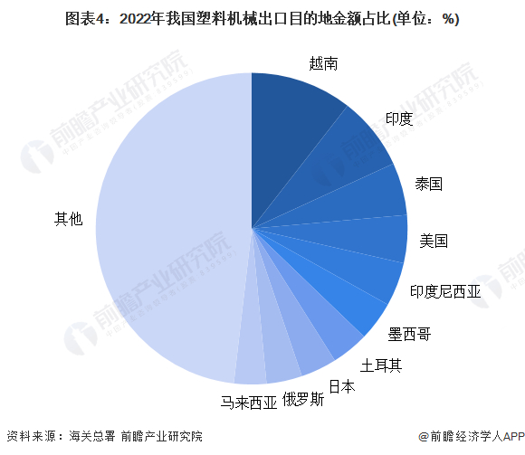 根据海关总署的数据,2022年我国塑料机械出口的主要目的地为越南,出口金额达到45.19亿元,占总出口金额的10%,其次是印度,出口金额达32.63亿元,占比8%,我国塑料机械出口目的地众多,其他地区占比亦相当可观,总体达到了48%。