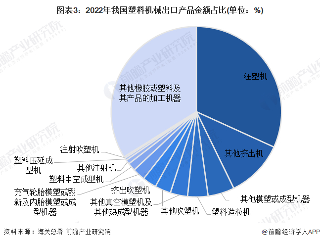 根据海关总署的数据,2022年,注塑机为我国塑料机械出口的第一大类,占总量的31.80,除此之外,其他挤出机和其他模塑或成型机亦占有较大比重,分别占总量的10.96%和5.03%。