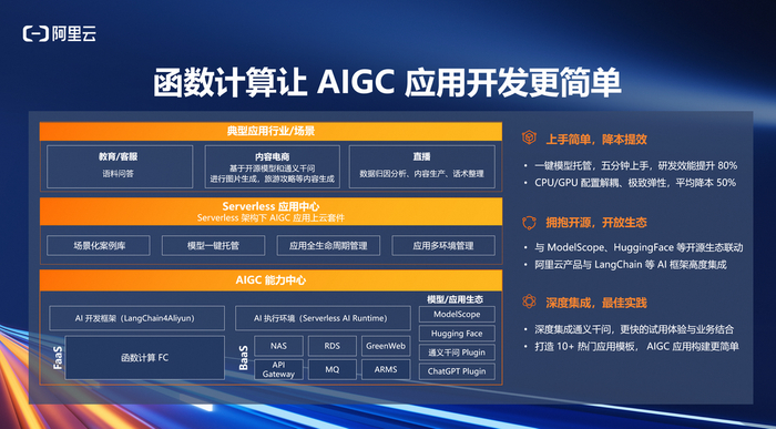 今年,生成式 AI 迎来了集中爆发期。函数计算也快速整合了 Serverless 应用中心、Serverless Devs 等完备的 AIGC 应用上云套件,帮助开发者实现业务 Serverless 化,通过丰富的应用模版、行业首发 GPU 按用付费的能力,让 AIGC 应用开发更简单。