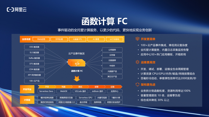 阿里云函数计算 FC 支持 100多款云产品事件驱动,帮助用户进一步降低用云复杂度,实现开发、构建、调试、部署到运维全生命周期管理,运维 0 负担。自发布至今,函数计算已经帮助上万家企业跨越技术鸿沟,业务快速创新。