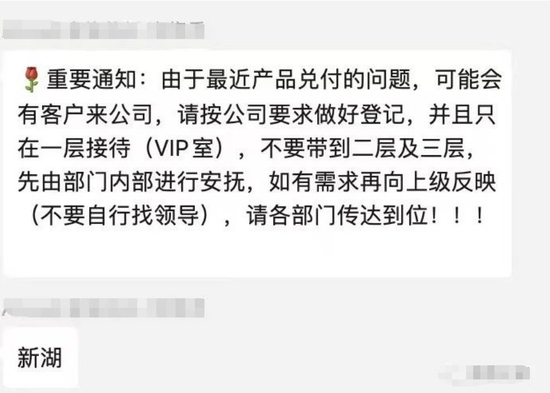 据《债基之家》报道,网传一张新胡财富工作群的聊天记录截图流出,大致内容为“由于最近产品兑付的问题,可能会有客户来公司,请按公司要求做好登记,接待工作”。