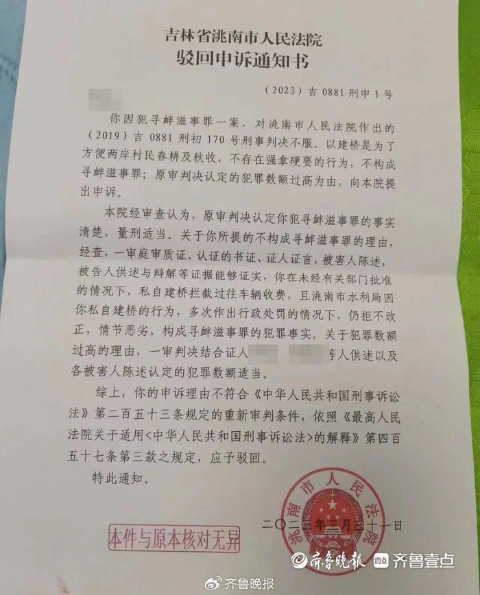 黄德义一直没有放弃申诉。今年3月31日,黄德义的申诉被洮南市法院驳回,驳回理由是,法院认为,其在未经有关部门批准的情况下,私自建桥拦截过往车辆收费,且受到多次行政处罚的情况下仍拒不改正,情节恶劣,构成寻衅滋事罪的犯罪事实。申诉不符合相关法律规定,应予驳回。