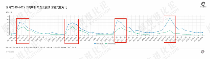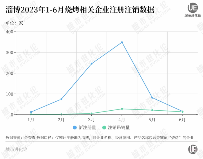 城叔在企查查上检索发现,每年的3、4、5月是淄博烧烤相关企业的活跃期,新增注册的多,注销的也集中在这几个月,疫情三年也在遵循这一规律。
