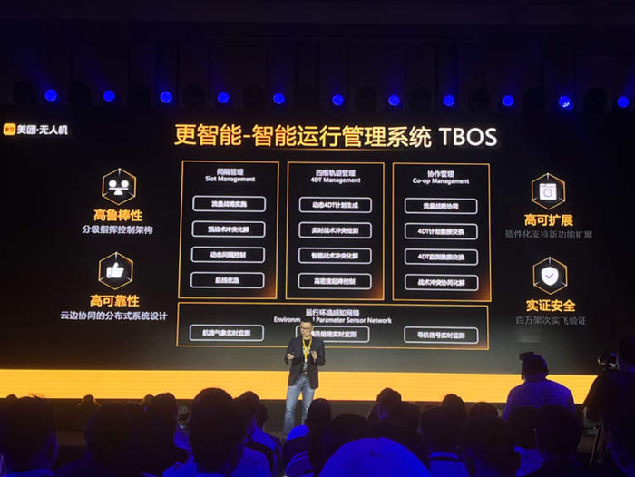 此外,美团无人机还有一个智能的运行管理体系,“英文是TBOS,目前是世界上最先进的无人机管控理念。基于飞行器四维时空轨迹,管控时空资源,这套系统除了管理飞机自身,还需要管理机位间的关系,并关注城市气象信息、导航信号、通讯信号,所有的因素考虑在一起,保证飞行安全。”