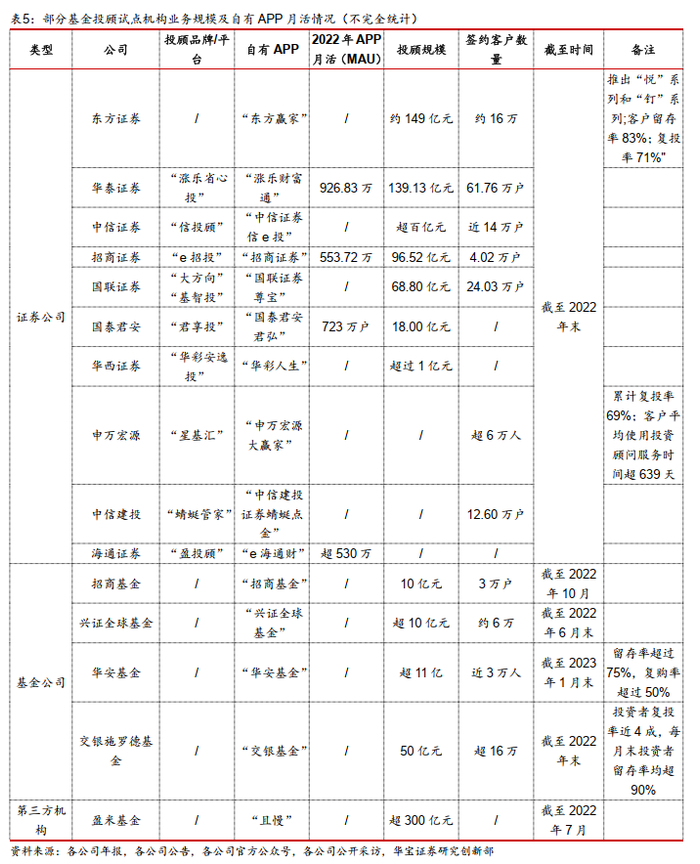 展业渠道是机构触及客户实现策略输出的基石,拓展线上平台一度成为行业开展投顾业务的“标配”。根据对已经展业的持牌基金投顾机构的业务进展情况的不完全统计发现,多数券商采用“投顾品牌+线上APP”协同推进的投顾业务模式,投顾业务规模及签约客户数相对亮眼,例如,华泰证券“涨乐省心投”投顾品牌+自有APP涨乐财富通协同发力,根据华泰证券2022年报显示,截至2022年末,华泰证券基金投顾规模139.13亿元,签约客户数量61.76万户;基金公司限于渠道端劣势,投顾业务规模及签约客户数量相对较低;部分第三方机构凭借平台流量优势投顾展业成绩亮眼,根据盈米基金CEO公开采访数据,截至2022年7月,第一批获批投顾牌照的盈米基金投顾业务规模超300亿元;持牌的3家银行投顾业务参与度较低。