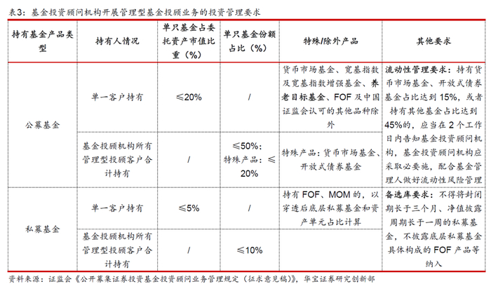 “投资”活动:拓宽可投标的和服务场景,优化投资分散度。一是对于管理型投顾策略配置中单只基金份额占比有所优化放宽,新增对于管理型基金投顾客户持有单只货币市场基金、开放式债券基金份额占比要求,且持有占比高的基金需要满足流动性管理要求。二是投资标的拓宽至私募证券投资基金,限制持有私募基金份额占比,若持有FOF、MOM等产品,需以穿透后底层资产单元占比计算;私募备选库制定时,不披露底层私募基金具体构成的FOF产品不得纳入。三是考虑纳入养老场景,服务居民养老金融需求,对于单一客户持有单只养老目标基金市值占比有所放宽。