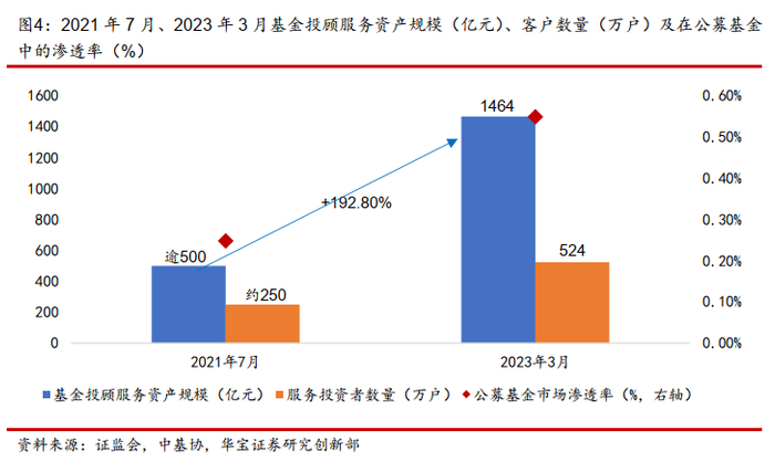 基金投顾业务平稳试点,服务资产规模超千亿元。2019年以来,基金投顾业务试点先行,稳步发展。2021年7月16日,证监会新闻发言人高莉表述,彼时基金投顾服务资产规模已逾500亿元,服务投资者约250万户。根据证监会数据披露,截至2023年3月底,60家纳入试点机构合计服务资产规模1464亿元,与2021年7月相比增加约964亿元,增幅192.80%;合计服务投资者数量524万户,相比2021年7月增加250万户,增速109.60%,10万元以下的个人投资者占比94%。