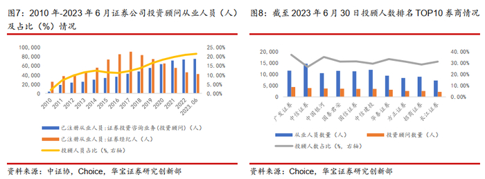 近年来,证券公司开启财富管理转型,积极优化调整人力资源结构,持续吸纳培养具备资产配置能力和综合金融服务能力的投顾团队。根据中证协数据统计,券商从业人员结构不断优化,证券经纪人逐步转变向投顾转型,投顾从业人员逐渐壮大,截至2023年6月30日,证券公司已注册投资顾问人数7.49万人,在券商已注册从业人员中占比提升至21.44%。细分券商看,根据Choice统计数据,截至2023年6月30日,广发证券、中信证券、中国银河等7家头部券商投顾人员超3千人,在获得基金投顾牌照的29家券商中,中信证券以投顾人数3874人排名第一。
