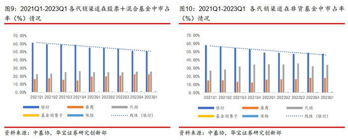 基金代销中银行保有规模市占率持续下滑,探索与券商持牌机构合作或是破局的较优选择。根据中基协数据统计,从2021Q1到2023Q1,银行渠道股票+混合基金规模从3.32万亿大幅缩减至2.89万亿,非货基金代销规模从3.77万亿小幅增至2.89万亿,市占率分别降低10.37个百分点、10.66个百分点;然而券商渠道股票+混合、非货基金保有规模市占率分别提升6.07%、2.92%。银行机构在公募基金代销中的渠道优势逐步被券商和第三方机构蚕食,而且目前银行持牌机构较少,券商基金投顾持牌机构未来若进一步扩容,银行渠道“半壁江山”规模地位更容易受威胁。由此可见,银行要想留住现有客户、维持基金代销渠道优势,在合规前提下以其客户优势探索与持牌券商建立合作展业模式将是破局之路。