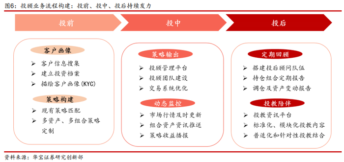 投前、投中、投后三阶段发力,提供动态专业化服务。当前国内投顾业务开展过程中更加重视投前和投中阶段,投后阶段服务相对缺失。建立全流程投顾业务生态需要投前+投中+投后持续发力,投前:建立客户信息数据库及投资档案,选定合适维度描述用户画像,动态匹配现有产品策略池或提供定制化方案;投中:依靠投顾团队提供多样化组合策略选择,依托渠道平台提供便捷、清晰化交易服务,辅以市场行情、组合动态监控;投后:提供组合持仓的定期报告、调仓和资产变动解读、持续性投资者陪伴服务等。