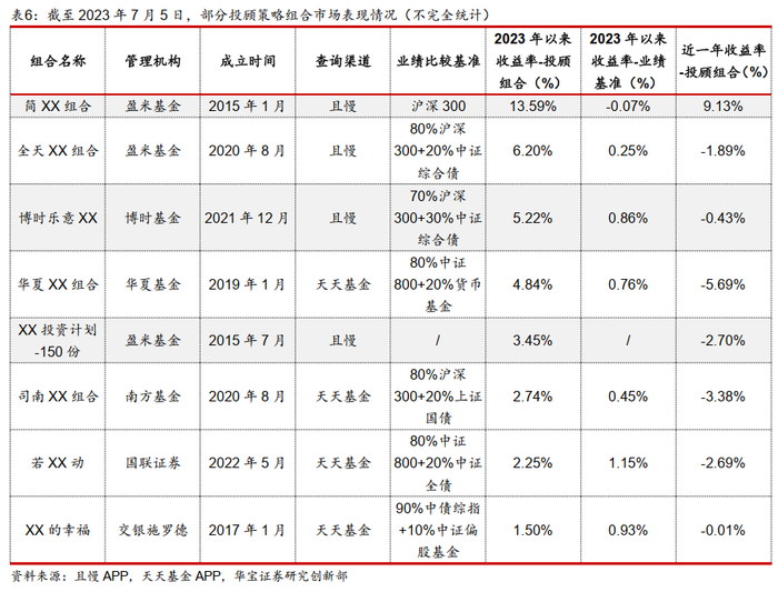 资本市场波动较大,市场投资观念有所转变,多数投资者渴望寻求“稳稳的幸福”。各机构为匹配客户需求、提升投资者获得感,加码构建多样化投顾策略组合。目前,市场常见的固收类、权益类,养老、教育、工资闲钱管理等适用于不同场景。通过对市场投顾组合收益率不完全统计分析发现,运行良好的投顾策略组合能够跑赢业绩基准,胜率相对较高,譬如,根据且慢APP披露数据,截至2023年7月5日,盈米基金的“简XX组合”2023年以来收益率达13.59%,跑赢业绩基准13.66%,持有3年胜率达到98.70%;“固收+”投顾策略中,根据天天基金APP披露数据,交银施罗德招牌产品“XX的幸福”2023年以来跑赢业绩基准0.57%,表现相对亮眼。