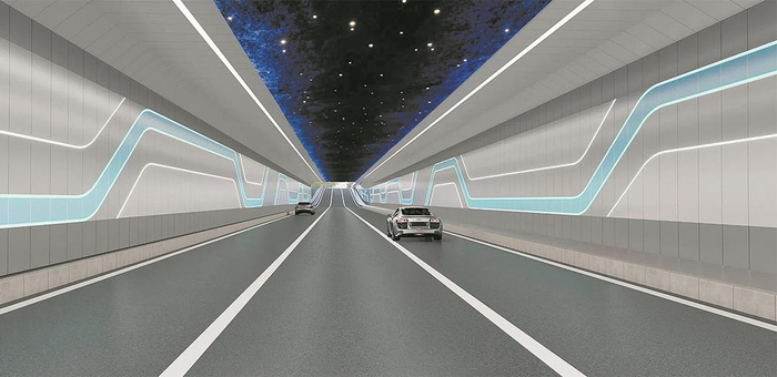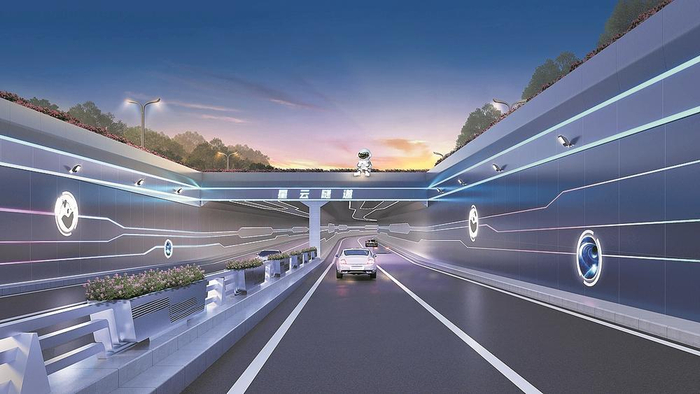 刚刚通车的蜀信路下穿设计为时光隧道既视感,即将通车的另外两条隧道也非常有特色。望丛祠大街下穿起于城南小学,往南下穿成灌高速,止于IT大道,全长0.77公里,宽45米,双向8车道(隧道双6),设计速度50km/h。它最吸引眼球的就是颜值爆表的星空穹顶,深蓝底色配以大小不一的装饰灯,犹如银河在眼前铺开。望帝路下穿起于兰家院子规划路,往南下穿成灌高速,止于清水河北侧规划路,全长0.88公里,宽35米,双向6车道(隧道双4),设计速度40km/h。整条隧道采用简洁的彩色线条勾勒,隧道洞口顶上设计了一名宇航员雕塑,驶入隧道仿佛能听到来自宇宙的呼唤。