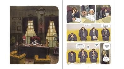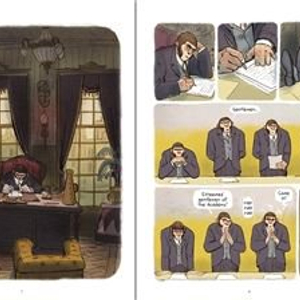找到合适的重要节点并非难事,这也从侧面印证了卡夫卡对其身后各类创作的影响之深远。尽管如此,我们却必须首先讨论那些试图从原教旨主义角度对卡夫卡本人进行“致敬”的作品,比如前文中提到的图像小说《致某科学院的报告》,创作者法国南特插画师马希·格莱德,除了将卡夫卡的同名小说进行了忠实图像化还原之外,再没有做其他任何多余的事情。假如以一根坐标轴来对一系列作品的“卡夫卡风”进行量化,左端为注重“形似”,即尽可能复现卡夫卡本人的原著,右端为注重“意境”,即更倾向于继承卡夫卡的创作精神、切合自身情况来进行自由创作的话,这位格莱德先生必定是左得不能再左。如此形似的“致敬”作品是极为罕见的,甚至可以说是独一无二的,因此,马希·格莱德必定是“卡夫卡风”坐标轴上的一个重要节点。