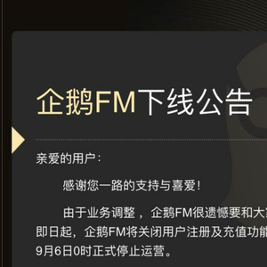 北京时间7月5日,企鹅FM发布官方公告,称由于业务调整即日起关闭用户注册、充值功能,并在今年9月6日0:00正式停止运营。