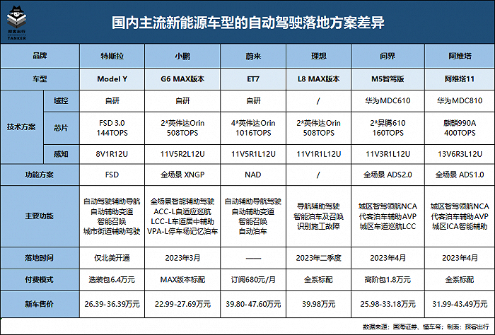「探客出行」结合国海证券研报和懂车帝数据,分析了几款有着不同自动驾驶方案的中(中大)型SUV发现,能算得上自动驾驶行业落地的第一梯队玩家,似乎只有特斯拉、小鹏、华为(含问界和阿维塔)和百度(萝卜快跑)这屈指可数的几家。
