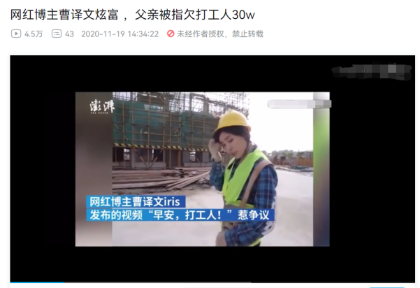 但这些相对高姿态的炫富很容易遭到网友的抵制,甚至有些虚假内容也很容易被网友扒出来。例如,曾经在B站拥有几十万粉丝的网红博主曹译文,就因为一条“瞒着家人,潜入自家建筑工地体验工人的一天”的视频引发了争议,后续还被扒出“父亲欠打工人30万”等黑料。如今,曹译文的B站账号已经删除了所有内容。