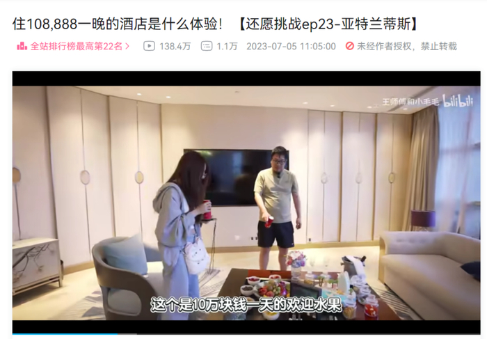 而在B站,这类博主们的炫富内容还会叠加更多知识科普、产品介绍,会呈现更多细节,比如曹译文曾经就通过贵妇医美、百万衣橱来打造自己的“富婆日常”,博主王师傅和小毛毛通过“凭啥这么贵”系列,向网友展现了“住108888一晚的酒店是什么体验”、“蟹粉狮子头一颗228元”等主题,满足了很多人的好奇心。
