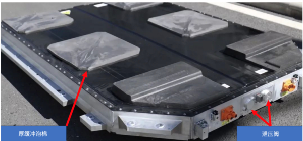 从外观来看,麒麟电池的电池包顶部配备了厚重的缓冲泡沫,前端和后端则设置了多个压力释放阀。