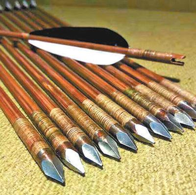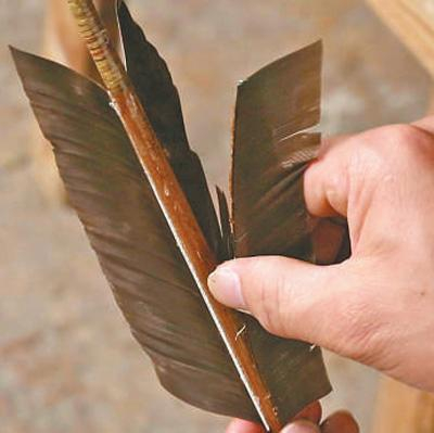 箭杆校直后,锉平竹节,打磨箭杆表面,再将桐油均匀抹在箭杆上,以防其受潮腐化。随后,安装生铁箭头,箭尾开槽,并在箭的头尾缠上牛筋增强保护,最后粘上火鸡刀翎制成的箭羽,一支竹箭才算制作完成。