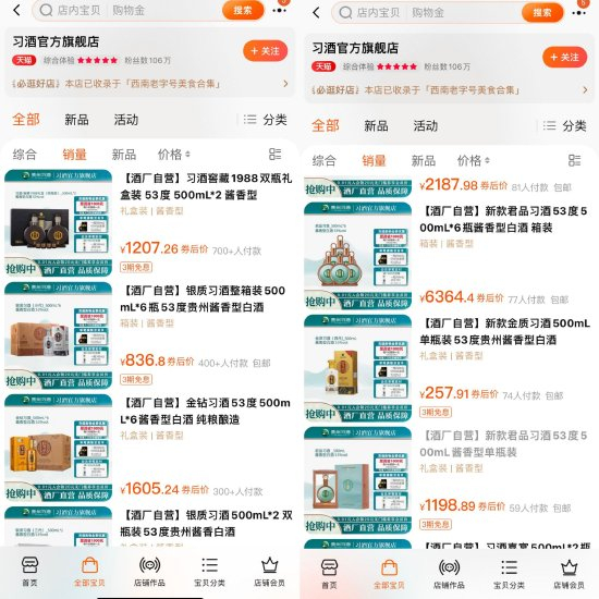 通过天猫平台显示的数据可知,习酒官方旗舰店销量最高的产品为窖藏1988双瓶礼盒装,月销量也才800+。而习酒主推的产品君品习酒,53度/500ml单瓶装月销量仅73单,双瓶装月销为87单,整箱6瓶装月销为96单。而在京东平台,2017年5月19日开店至今的习酒官方旗舰店,用户评价仅有3.8分,超过36.89%的同行;售后服务仅有3.9分,超过21.59%的同行。