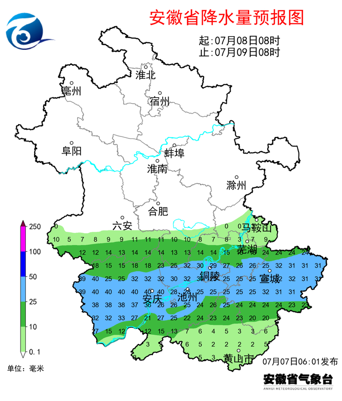 由于7日至9日强降水区维持在江淮南部和江南,且短时雨强大,城市内涝和农田渍涝的风险较高,大别山区和皖南山区可能引发山洪、地质灾害。六安、安庆、滁州、池州、铜陵、芜湖、马鞍山、宣城等地需提前做好相关防范措施。