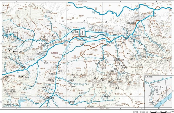 李晓杰:没错。新的《水经注图》是在1:25万的地形图上绘制的,因此,每一条支流、每一处自然人文地理要素都非常清晰。在地图的展现形式上,我们采用了“古墨今朱”的形式并略做变通,古水以蓝色标绘、古地以黑色字体标注,今水、今地以红色字体标示,将古水、古地与今水、今地对照反映。对于一些著名的城邑和水利工程,我们还有放大的局部图。通过将索引图、概念图、全流域图、流域内分图、局部放大图等相结合进行了呈现方式上的创新。一张地图,只有让它“好用”,后续才能被“用好”。