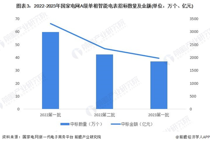 根据国家电网新一代电子商务平台数据显示,A级单相智能电表需求连续下跌。2023年第一批智能电表招标中,A级单相智能电表仅39.41亿元,相比2022年第二批次下跌15.75%。