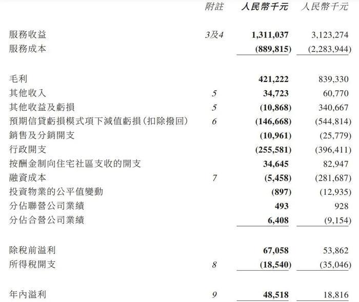 究其原因,主要是财务成本降低明显。2022年,彩生活的融资成本仅为545.8万元,2021年这一数据为2.82亿元。另外明显的是预期信贷亏损模式项下减值亏损,从2021年的约5.45亿元降低到2022年的1.47亿元。再加上出售核心子公司后,行政开支等费用也下滑,最终净利润数据有所改善。