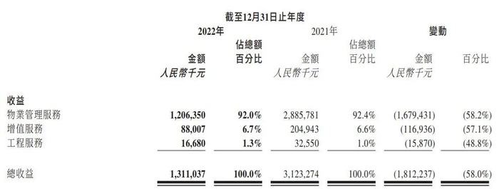 如上图,数据显示,2022年彩生活营收急剧缩水,从2021年的31.23亿元,降到13.11亿元,同比降幅58.02%。财报中称,营收减少的主要原因是2021年出售主要附属公司,导致物业管理服务、增值服务、工程服务收益减少,这三大业务也是彩生活目前的主要业务。