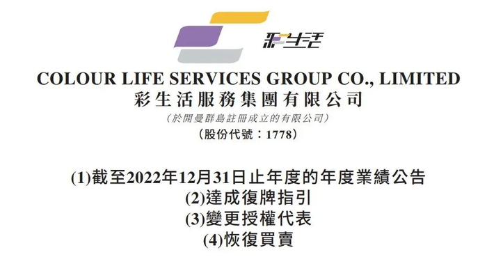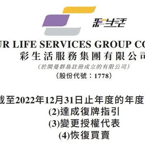 2023年7月6日,彩生活发布公告:将于当日上午9时起恢复买卖。一同披露的还有该司2021、2022年业绩公告,及2022年中期业绩公告。