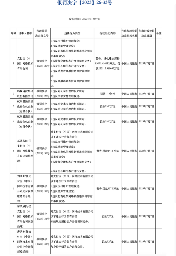 7月7日,中国人民银行发布的行政处罚信息显示,支付宝(中国)网络技术有限公司,因违反支付账户管理规定等,被警报并罚没约30.62亿元,蚂蚁科技集团股份有限公司因违反对公司治理的相关规定、违反关联交易管理规定,被中国人民银行罚款1.75亿元。