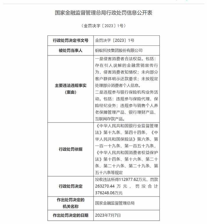金融监督管理总局:蚂蚁科技集团被罚没合计超37.62亿元