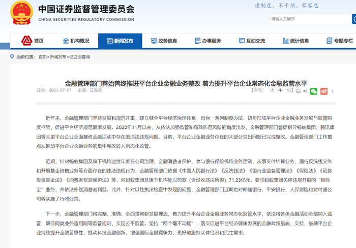 据央行、证监会官网,近年来,金融管理部门坚持发展和规范并重,建立健全平台经济治理体系,出台一系列制度办法,初步形成平台企业金融业务发展与监管制度框架,促进平台经济规范健康发展。2020年11月以来,从依法加强监管和有效防范风险的角度出发,金融管理部门督促指导蚂蚁集团、腾讯集团等大型平台企业全面整改金融活动中存在的违法违规问题。目前,平台企业金融业务存在的大部分突出问题已完成整改。金融管理部门工作重点从推动平台企业金融业务的集中整改转入常态化监管。