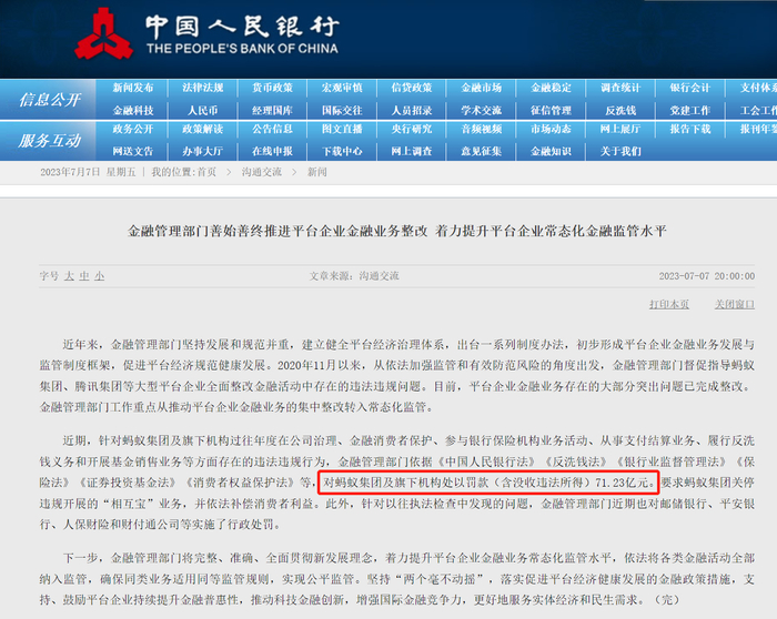 7月7日,央行、证监会官网显示,蚂蚁集团及旗下机构近期被处以罚款(含没收违法所得)71.23亿元。
