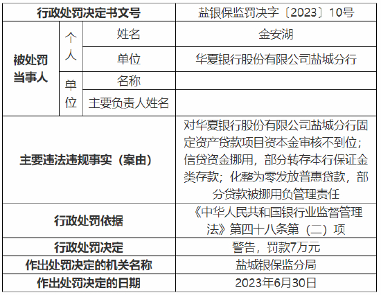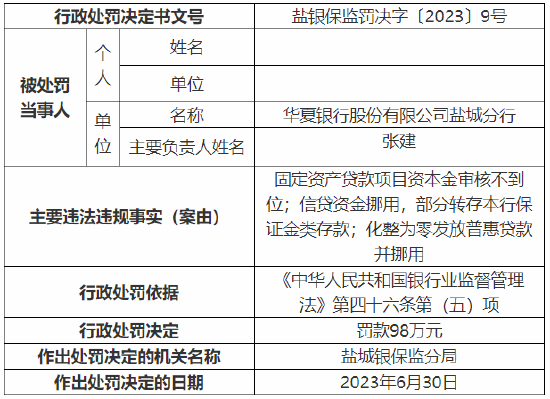 7月7日金融一线消息,据国家金融监督管理总局网站发布的行政处罚信息公开表显示,华夏银行盐城分行因固定资产贷款项目资本金审核不到位、信贷资金挪用,部分转存本行保证金类存款以及化整为零发放普惠贷款并挪用,被监管罚款98万元;