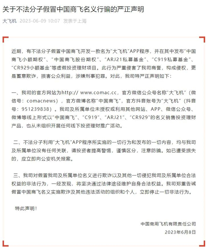 6月9日,中国商用飞机有限责任公司微信公众号“大飞机”发布《关于不法分子假冒中国商飞名义行骗的严正声明》。