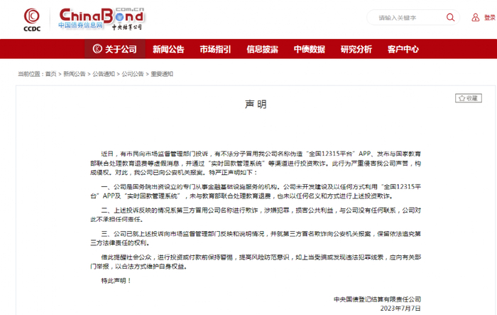 7月7日,中央国债登记结算有限责任公司(下称中央结算公司)发布声明称,近日,有市民向市场监督管理部门投诉,有不法分子冒用公司名称伪造“全国12315平台”APP、发布与国家教育部联合处理教育退费等虚假消息,并通过“实时回款管理系统”等渠道进行投资欺诈。此行为严重侵害公司声誉,构成侵权。对此,公司已向公安机关报案。