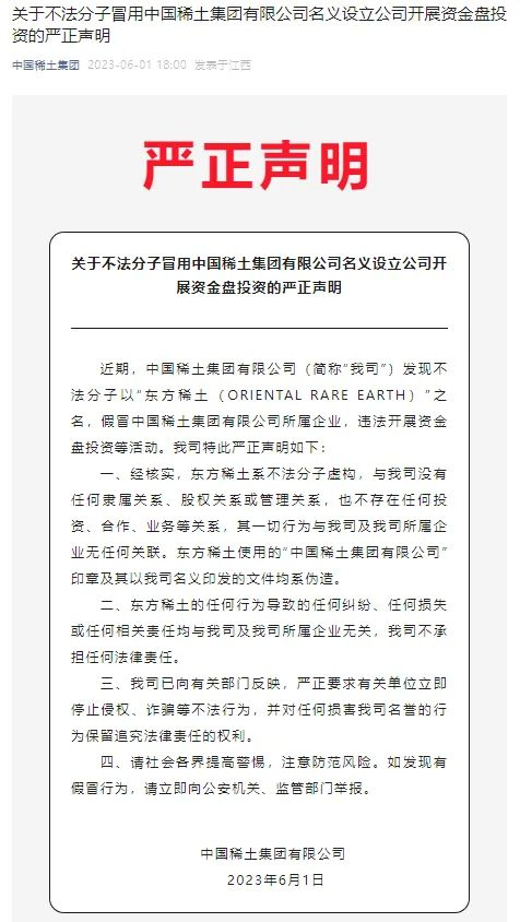 6月1日,中国稀土集团有限公司微信公众号发布《关于不法分子冒用中国稀土集团有限公司名义设立公司开展资金盘投资的严正声明》。