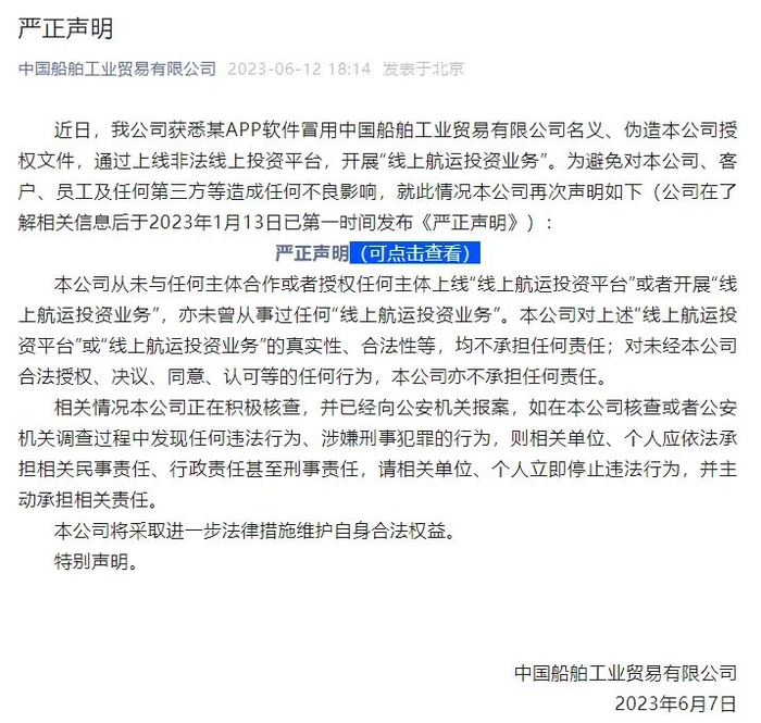 声明称,近日,公司获悉某App软件冒用中国船舶工业贸易有限公司名义、伪造本公司授权文件,通过上线非法线上投资平台,开展“线上航运投资业务”。