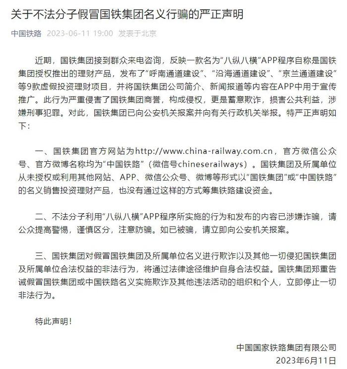 声明称,近期,国铁集团接到群众来电咨询,反映一款名为“八纵八横”App程序自称是国铁集团授权推出的理财产品,发布了“呼南通道建设”“沿海通道建设”“京兰通道建设”等9款虚假投资理财项目,并将国铁集团公司简介、新闻报道等内容在App中用于宣传推广。此行为严重侵害了国铁集团商誉,构成侵权,更是蓄意欺诈,损害公共利益,涉嫌刑事犯罪。对此,国铁集团已向公安机关报案并向有关行政机关举报。