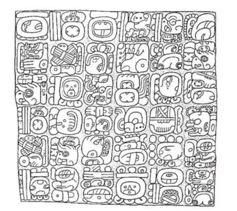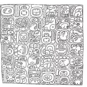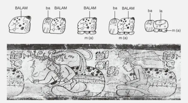 玛雅文字中,同一字的书写方式很灵活。上图为巴拉姆(美洲豹)的几种不同书写方式。下图为书写者正在完成他的作品,此时,他既是历史学家又是艺术家。