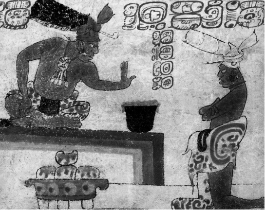 古典时代(公元前5—4世纪中叶)一件容器上的图案,左侧是一位玛雅君主,身体朝向一个可可罐。