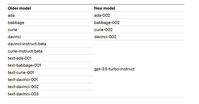 此外,OpenAI还宣布了一些弃用模型和全新的版本。例如,davinci-instruct-beta、gpt- curie-instruct-beta、text-ada-001、text-babbage-001 、text-curie-001 、text-davinci-001 、text-davinci-002 和text-davinci-003由gpt-3.5-turbo-instruct替代。