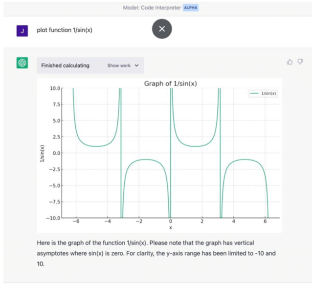 7、绘制复杂的数学函数图表,ChatGPT可以在没有任何提醒的作用下,快速绘制出一个函数图表。例如,绘制函数1/sin(x)。