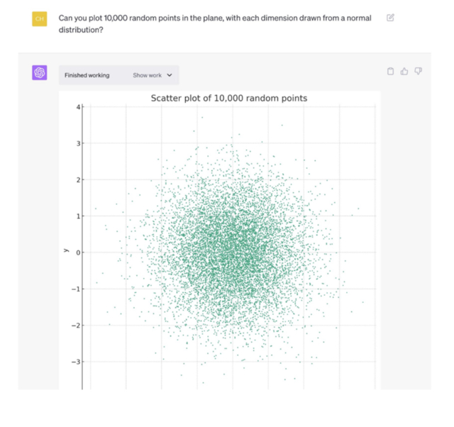 3、绘制基本图表:用户只需要提供基本数据、想法就能快速绘制基本图表。例如,你能在平面上绘制10000个随机点吗?每个维度都来自正态分布?